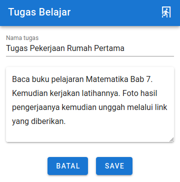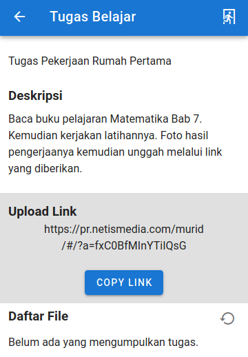 Untuk mendapatkan link upload yang akan digunakan oleh siswa, klik nama tugas belajar yang ada dalam daftar. Selanjutnya aplikasi akan menampilkan halaman seperti pada gambar berikut.